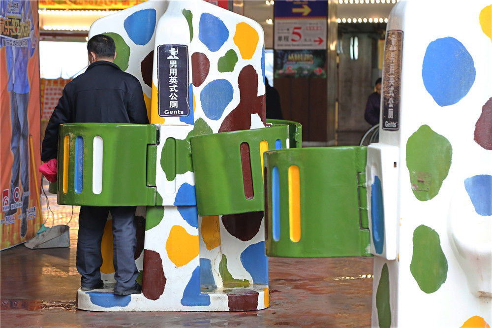 2017年3月15日,重慶,幾座“男用英式公廁”亮相洋人街景區路邊。這些供男士小便專用的露天公廁,每座有4個站位,仿造英式廁所建造,四面透風,只遮擋住腰部的部分。左冬辰/視覺中國