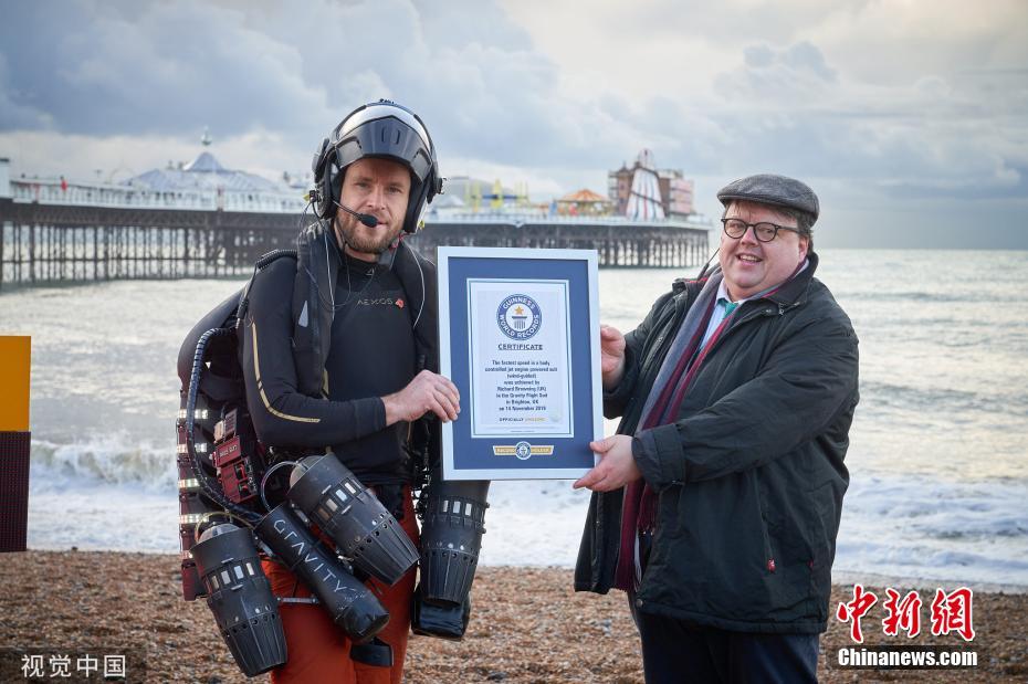 11月18日訊,英國布萊頓,英國發明家理查德·布朗寧穿著一套由身體控制、噴氣發動機驅動、風力導向的飛行服,以高達每小時85.06英里(約137公里)的飛行速度,打破了自己創下的噴氣式飛行服速度的吉尼斯世界紀錄。圖為工作人員為理查德·布朗寧頒獎。圖片來源:視覺中國