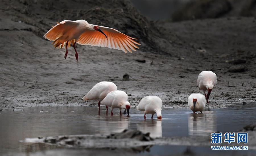 11月19日,朱鹮在陜西省漢中市西鄉縣峽口鎮井壩村牧馬河里覓食。 新華社記者陶明攝
