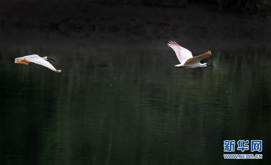11月19日,朱鹮飛翔在漢江支流的牧馬河畔。 每年冬季,成群結隊的朱鹮飛翔在漢江及漢江支流的河灘、濕地,覓食、棲息,成為當地一道亮麗的風景線。 新華社記者陶明攝