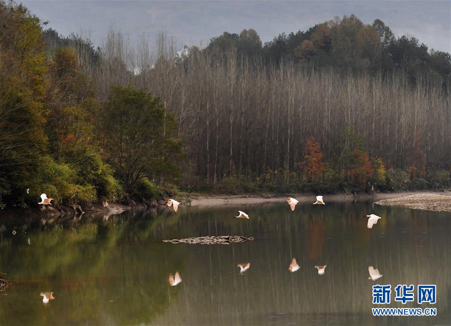 11月19日,朱鹮飛翔在陜西省漢中市西鄉縣峽口鎮牧馬河畔。 新華社記者陶明攝