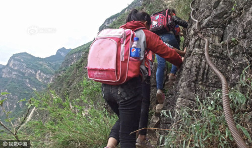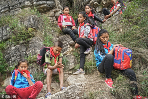 上學的孩子都背著沉沉的書包,大多數是女孩,15個孩子在三個家長的保護下,大約用了2個小時,到達“懸崖村”。上山容易下山難,遇到雨雪天氣,村里人就不再外出了。圖片來源:視覺中國