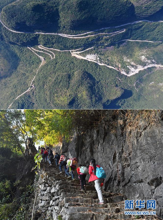 拼版照片:上圖為大化瑤族自治縣七百弄鄉弄良村弄丘屯剛剛修通的公路(右下段)和村道、鄉道連接(11月12日無人機拍攝);下圖為在尚未通路的弄良村弄丘屯,孩子們爬“天梯”回家(2016年12月9日攝)。新華社記者黃孝邦攝