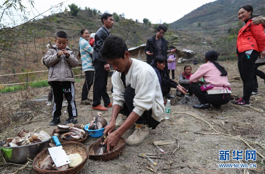 11月24日,在昭覺縣支爾莫鄉阿土列爾村,阿紅在切煮熟的豬肉和羊肉,準備跟鄰居分享。新華社記者江宏景攝