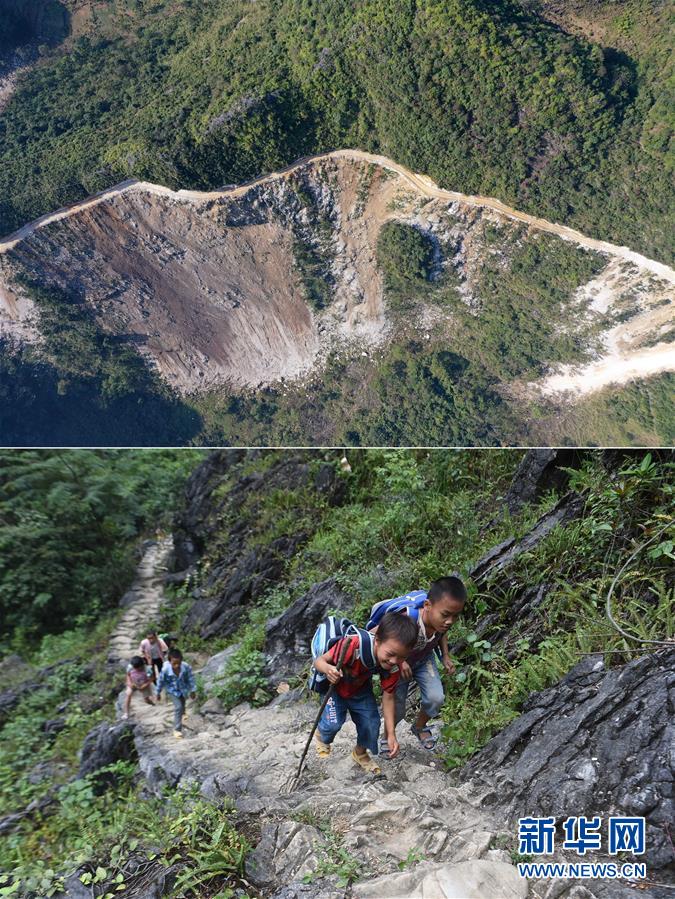 拼版照片:上圖為剛剛修通公路的大化瑤族自治縣板升鄉八好村弄麻屯(11月11日無人機拍攝);下圖為在尚未通路的八好村弄麻屯,孩子們爬山路回家(2016年9月23日攝)。新華社記者黃孝邦攝