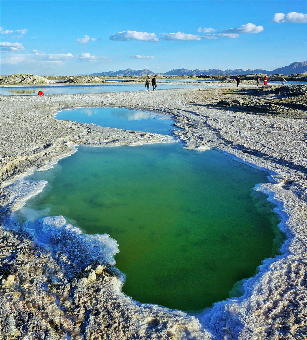 在青海柴達木盆地最西部的茫崖有一處硫酸鎂亞型人工鹽湖,以其翡翠綠色的鹽田與藍天白云和附近的丹霞地貌相映。李仁奇攝
