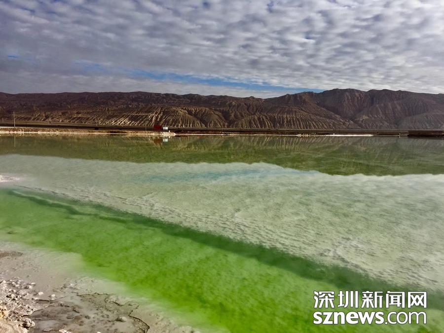 翡翠湖西距花土溝鎮28公里,就在315國道旁邊,它鉀肥鹵水的顏色純美剔透,如鑲嵌在戈壁的璞玉,形成了“水映丹霞、花土朝陽、昆侖橙霞”等魔幻奇觀。李仁奇攝
