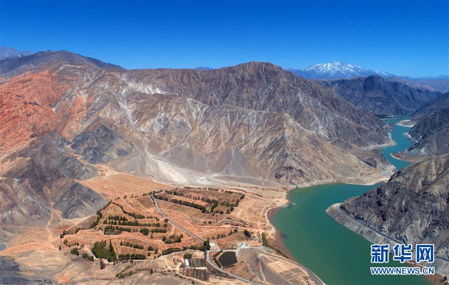 在青海貴德,千姿湖景區內群山與湖水相映成畫(4月16日無人機拍攝)。新華社記者張宏祥攝