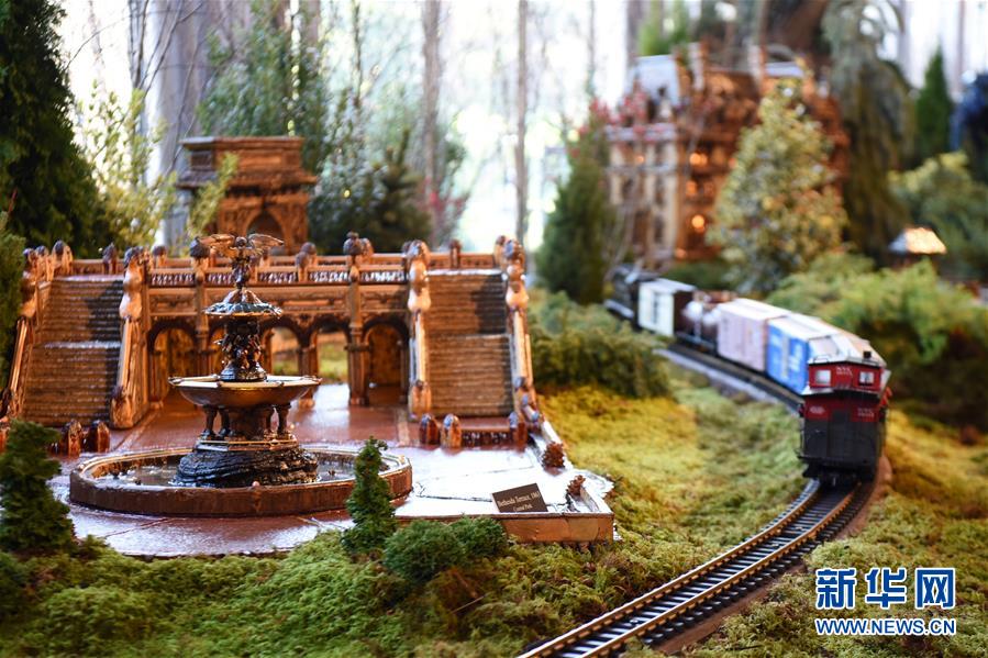 11月26日,在美國紐約植物園節日小火車展上,一輛模型小火車駛過紐約中央公園貝塞斯達噴泉和臺階微縮模型。新華社記者韓芳攝
