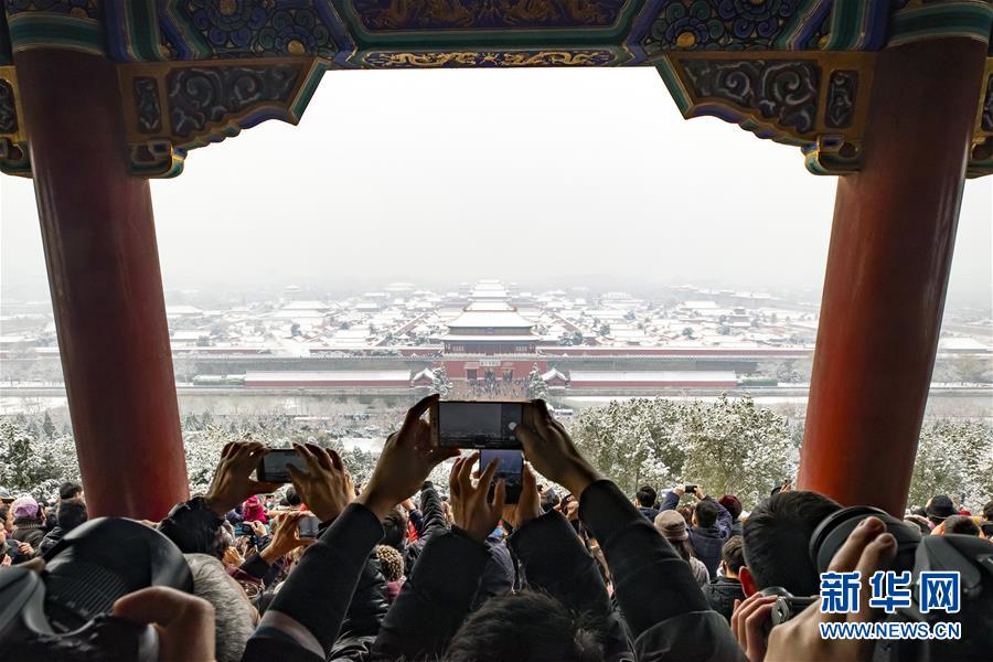 11月30日,人們在北京景山公園的萬春亭拍攝雪后的故宮。  新華社記者 沈伯韓 攝