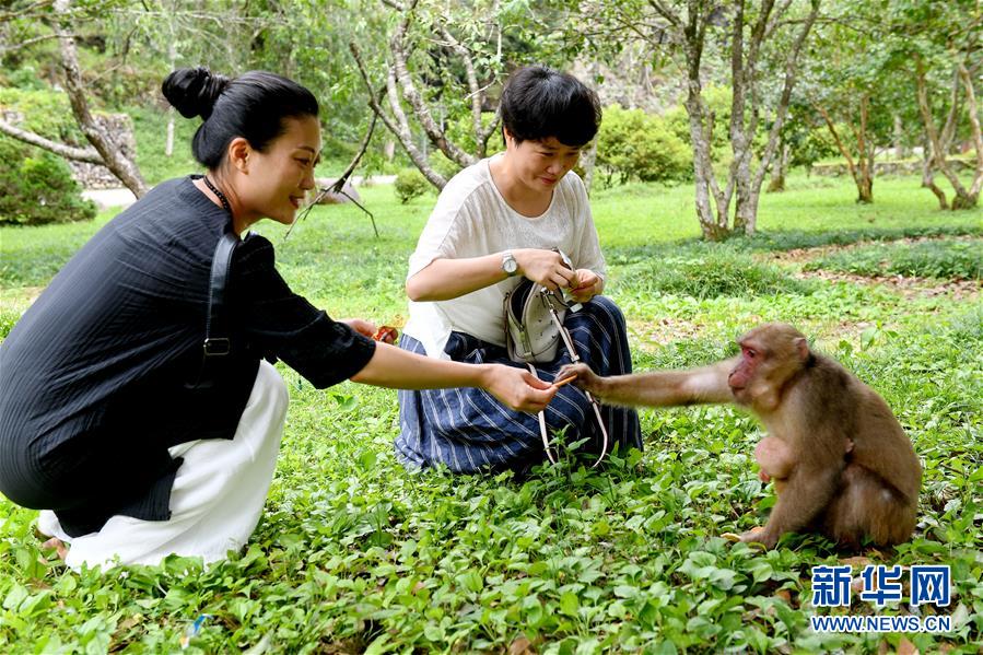 游客在武夷山自然保護區喂猴(7月20日攝)。新華社記者張國俊攝