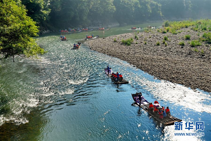 8月23日,游客在武夷山九曲溪乘竹筏游覽。暑期即將接近尾聲,福建武夷山游客仍絡繹不絕。盡管2019年暑期武夷山兩次遇到暴雨災害造成景區關閉,在當地旅游部門的努力下很快恢復旅游秩序。新華社記者張國俊攝