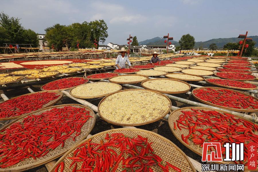 2019年9月9日,安徽黃山,呈坎古村村民在曬場上晾曬農(nóng)作物。