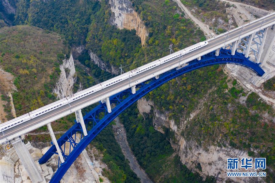 12月2日,一輛試驗列車駛過成貴高鐵西溪河大橋(無人機拍攝)。新華社記者劉續攝