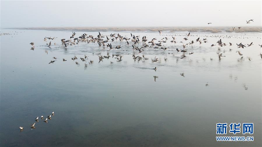12月7日,一群候鳥在升金湖上空飛翔(無人機拍攝)。新華社記者張端攝