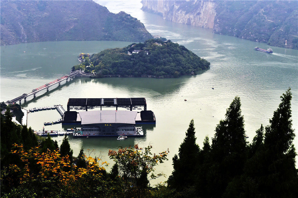 2019年11月3日,重慶,四面環水的“白帝城孤島”風貌,各種豪華游輪陸續駛往寶塔坪旅游碼頭,供游客們登島參觀。