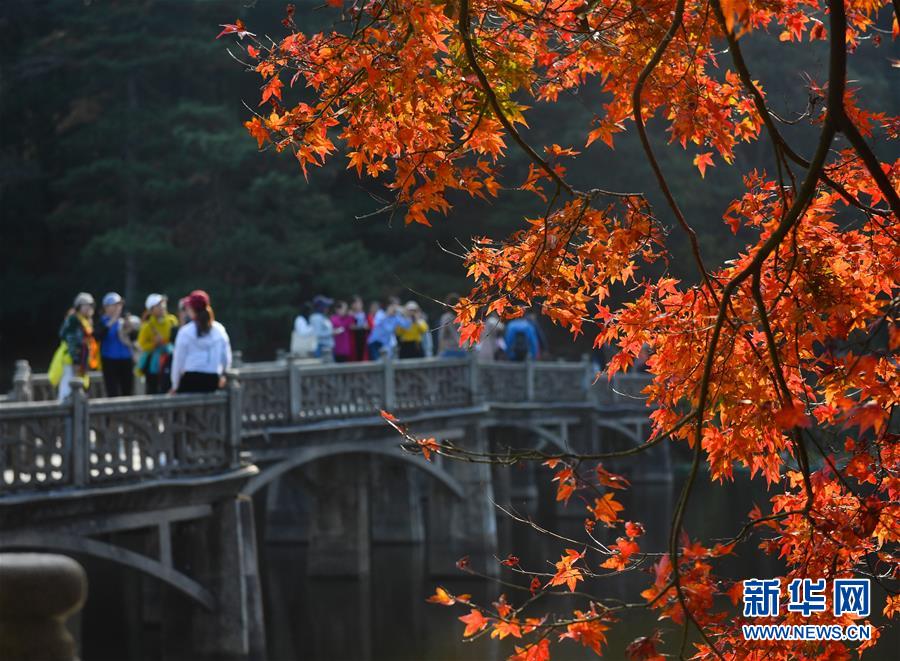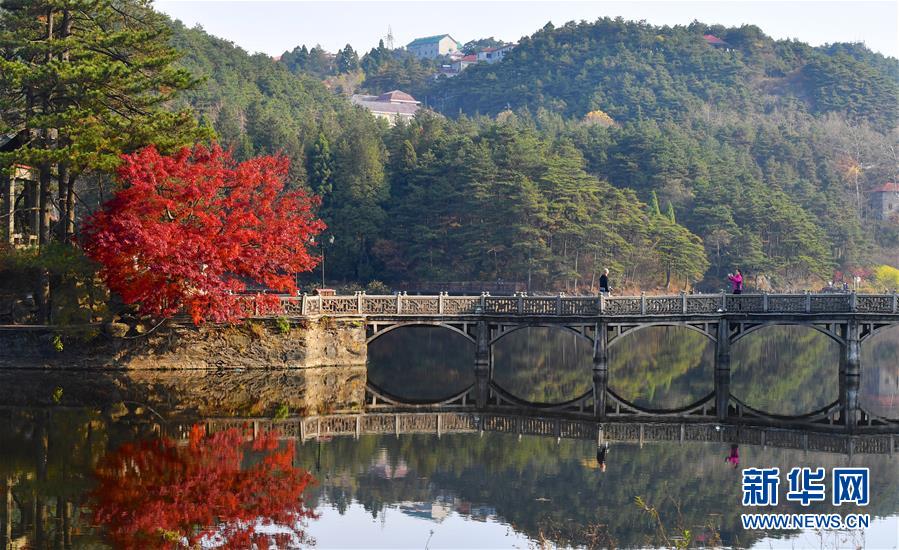 11月17日,游客在廬山如琴湖邊游玩。初冬時節,江西廬山風景區層林盡染,火紅的楓葉吸引眾多游客前來參觀,令人流連忘返。新華社記者胡晨歡攝
