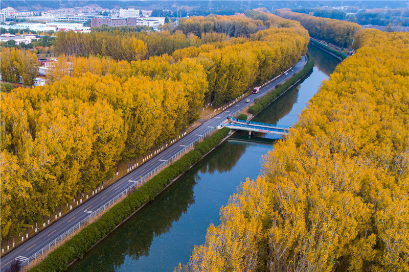 2019年11月03日,北京,京密引水渠昌平段,河道兩旁的楊樹葉已經變黃,碧水黃葉映襯,秋意正濃。
