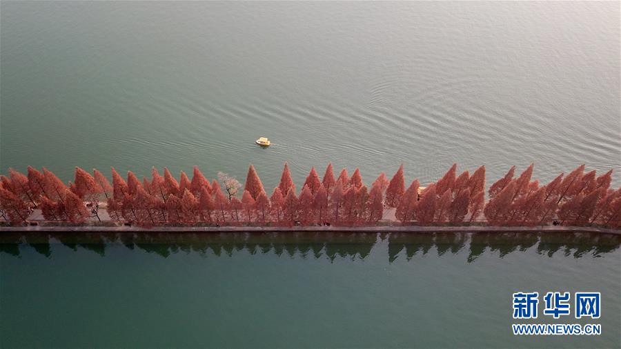 12月10日,一只小船在湖南烈士公園年嘉湖湖面行駛時經過游道(無人機拍攝)。新華社記者陳澤國攝