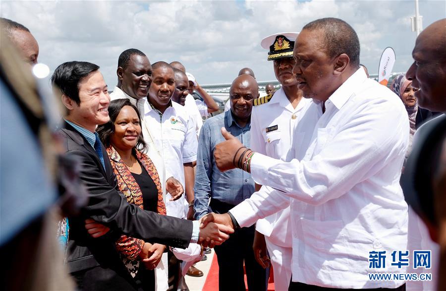 12月13日,在肯尼亞加里薩郡,肯尼亞總統烏胡魯·肯雅塔(右)出席光伏發電站投運啟動儀式。 中企承建的東非最大光伏電站肯尼亞加里薩50兆瓦光伏發電站13日正式投入運營。肯尼亞總統肯雅塔在投運啟動儀式上致辭說,這一電站將為加里薩帶來穩定供電,助力當地經濟發展。 新華社記者 楊臻 攝