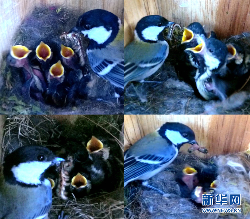 拼版照片:羅康在人工巢箱里安裝的錄像設備拍攝到鳥類在以松毛蟲喂食幼鳥(資料照片)。 新華社發
