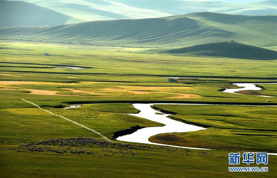 8月29日無人機拍攝的內蒙古呼倫貝爾市陳巴爾虎旗境內的莫日格勒河與羊群。新華社記者李京攝
