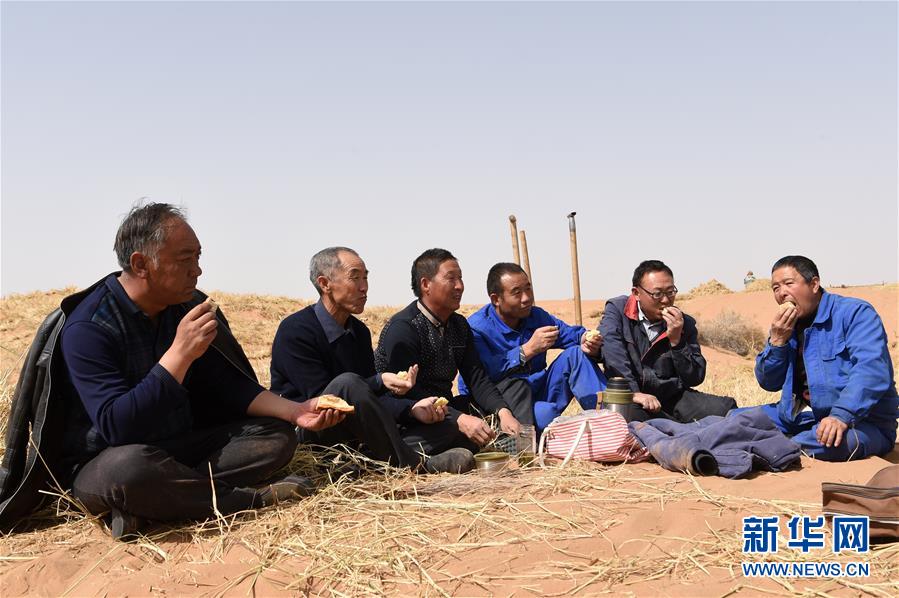 在甘肅省古浪縣境內的黑崗沙風沙口,八步沙第二代治沙人賀中強(左一)、郭萬剛(左二)、石銀山(左三)、羅興全(右三)、程生學(右二)、王志鵬(右一)在休息間隙吃午飯(3月26日攝)。二十世紀八十年代,八步沙是騰格里沙漠南緣甘肅省古浪縣最大的風沙口。當地六位年齡加在一起近300歲的老漢,在承包沙漠的合同書上按下手印,誓用白發換綠洲。38年過去,六老漢只剩兩位在世。