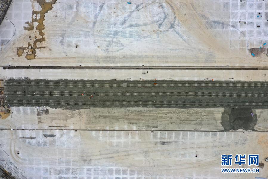 12月17日,中鐵八局建設者們在改貌鐵路口岸施工(無人機拍攝)。 新華社記者 劉續 攝