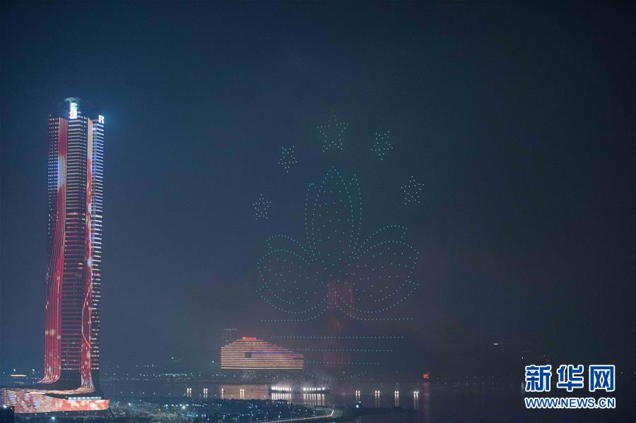 12月22日拍攝的煙花匯演上的無人機表演。當晚,澳門與珠海首次聯合舉行煙花匯演,慶祝澳門回歸祖國20周年。新華社記者張金加攝