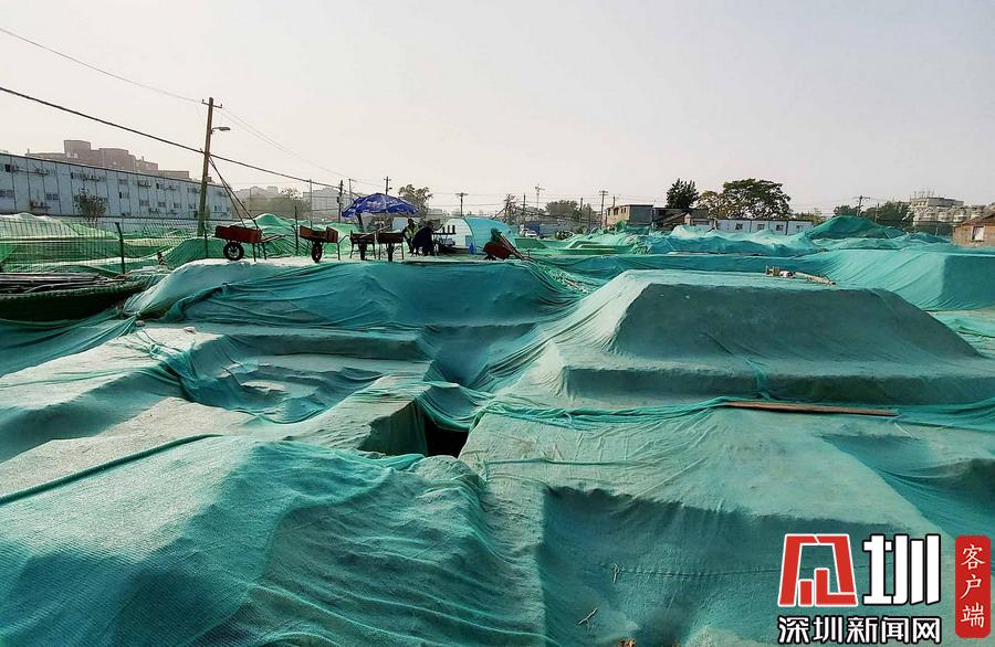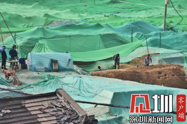 圍擋內,工地大部分被綠色苫布覆蓋,只露出幾處規整的探坑。考古工作者正在緊張忙碌中,有些工作人員戴著草帽,坐在馬扎上記錄發掘細節,還有一些穿著藍色背心的工作人員使用工具正在做清理工作。