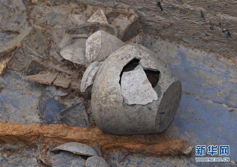 這是發掘的隨葬“搖錢樹”底座(11月15日攝)。