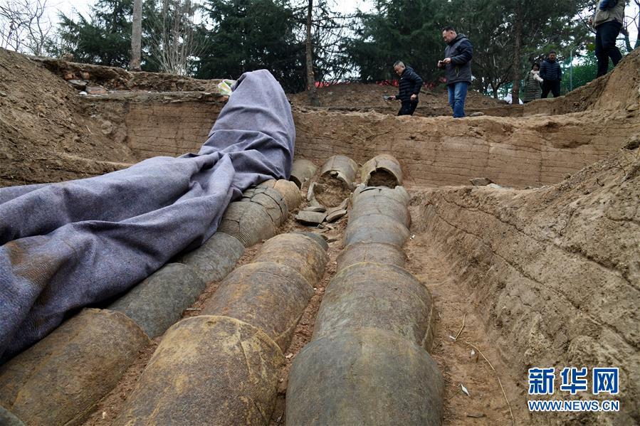 12月21日拍攝的瑯琊臺遺址考古發掘現場。三組整齊的陶制管道規整排列,管道較粗,管壁較厚,陶水管為兩端大小各異的標準件,與現代城市地下排水管件類似。新華社記者李紫恒攝
