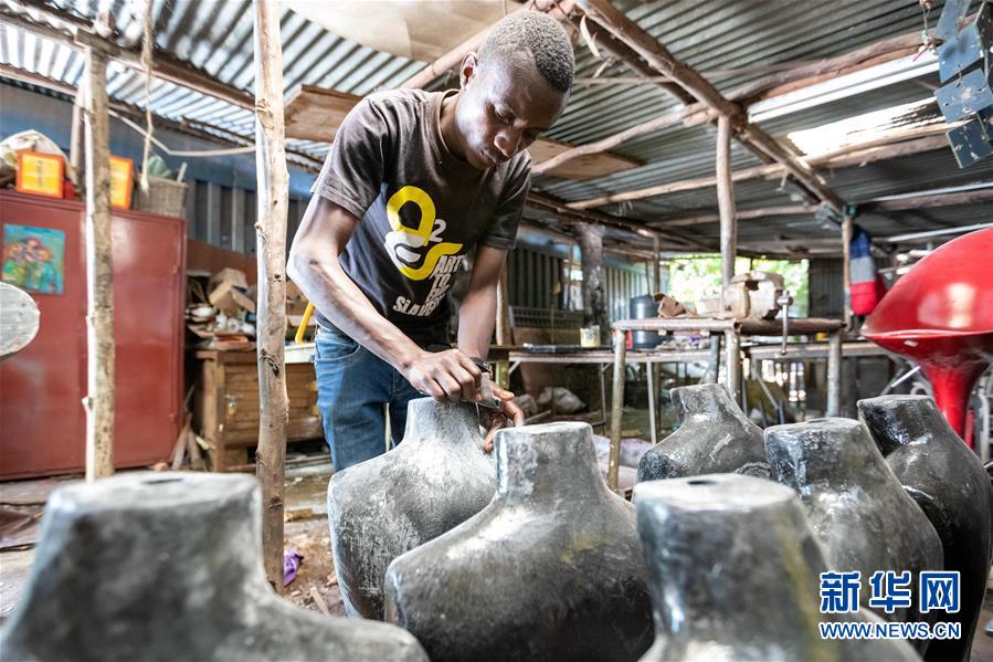 12月20日,在肯尼亞內羅畢庫奧納藝術中心,一名藝術家制作裝置藝術作品。 新華社記者 王騰 攝