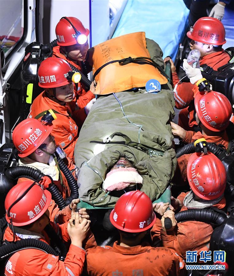 12月18日,救援人員轉運安全升井的被困人員。 當日7時56分,經過80多個小時的緊張救援,發生透水事故的川煤集團杉木樹煤礦13名被困人員全部安全升井。 新華社記者 薛玉斌 攝
