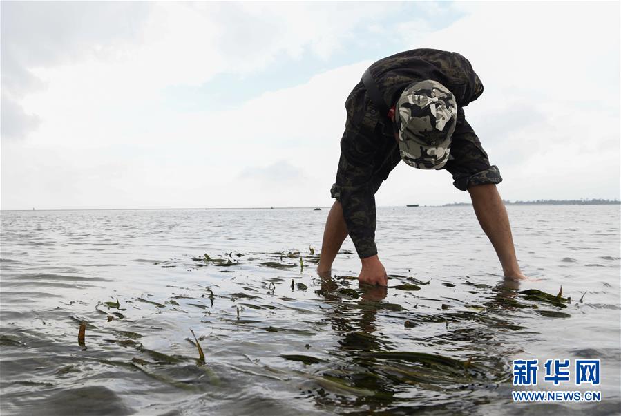 海南清瀾港省級自然保護區護林員呂詩陽在保護區內的灘涂上查看海草情況(12月17日攝)。  新華社記者楊冠宇攝