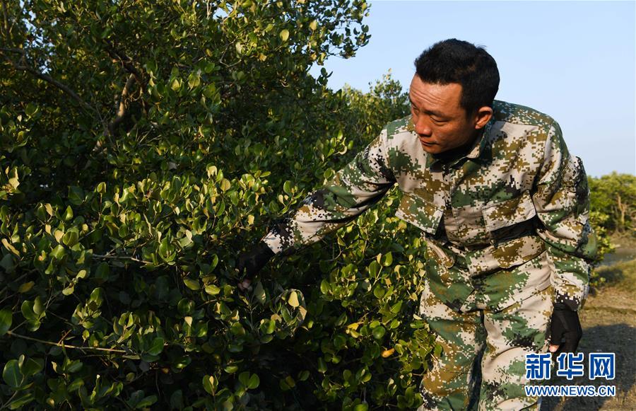 海南儋州新英灣紅樹林市級自然保護區護林員陳正平查看保護區內的紅樹林情況(12月9日攝)。陳正平2010年開始在保護區工作,他將工作發展成愛好,廣泛參加各種培訓和業內交流。他在工作中拍到瀕危鳥類白肩雕出現在海南的照片,這刷新了海南省的鳥種記錄。新華社記者楊冠宇攝