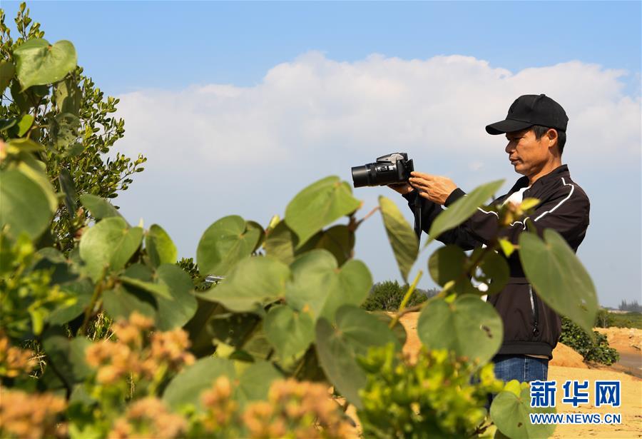 海南新盈紅樹林國家濕地公園巡護員兼監測員羅理想在濕地公園內拍攝紅樹林(12月11日攝)。 羅理想2006年起開始參與紅樹林濕地的保護工作,近年來他參加了很多關于濕地的培訓。2016年,羅理想在工作中監測到極危鳥種勺嘴鷸,當時有許多媒體做了報道,后來他又配合專家在濕地公園里發現了拉氏紅樹,“那個時候感覺自己的工作很有價值”,羅理想說。新華社記者楊冠宇攝