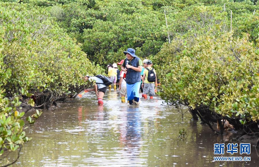 海南東寨港國家級自然保護區林業工程師馮爾輝(前)在保護區內為學生進行講解(7月16日攝)。 馮爾輝2009年大學畢業后來到保護區工作,小時候他家就住在紅樹林邊上,他從小和紅樹林打交道,喜歡動植物和鳥類。外貿專業畢業的他邊工作邊學習,目前主要從事鳥類監測、紅樹林保育、自然教育等工作?!凹t樹林看著我長大”,馮爾輝說,濕地保護的工作非常有意義。 新華社發