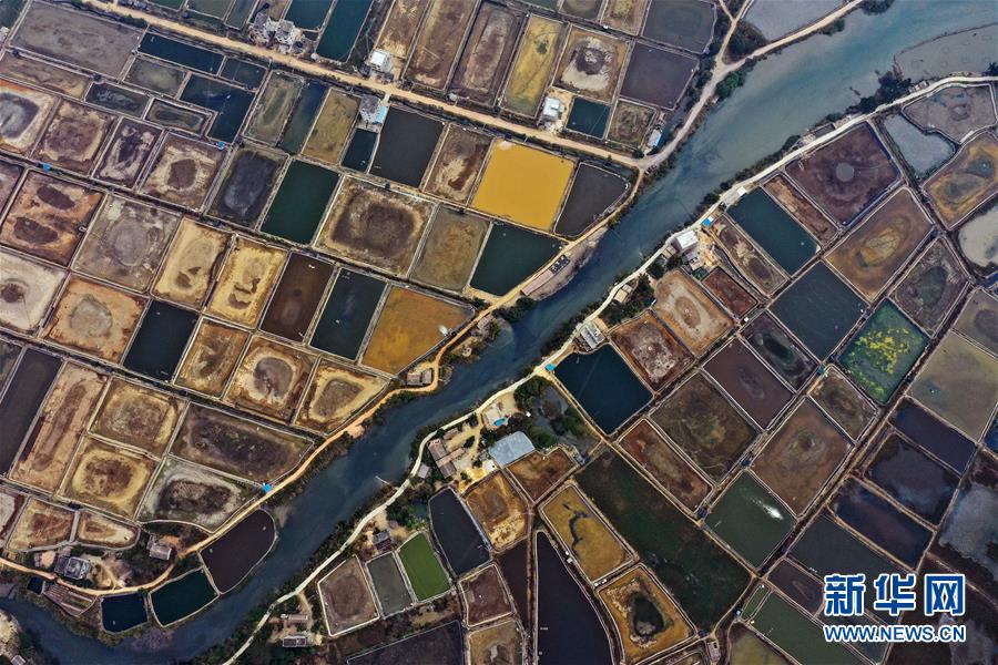 12月21日無人機拍攝的廣西合浦縣黨江鎮更螺圍出海口的蝦塘。冬日,廣西廉州灣海域風光別致。新華社記者張愛林攝