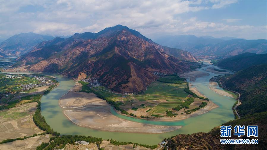 這是無人機拍攝的“長江第一灣”(3月17日攝)。“長江第一灣”位于云南省麗江市玉龍納西族自治縣石鼓鎮,萬里長江從青藏高原奔騰而下,與瀾滄江、怒江一起在橫斷山脈的高山深谷中穿行形成并流的壯麗景觀。金沙江在麗江石鼓鎮突然以急轉彎轉向東北,形成一個宛若“V”字形的大轉彎,得名“長江第一灣”。春日里,“長江第一灣”江水青碧,美景迷人。新華社記者胡超攝