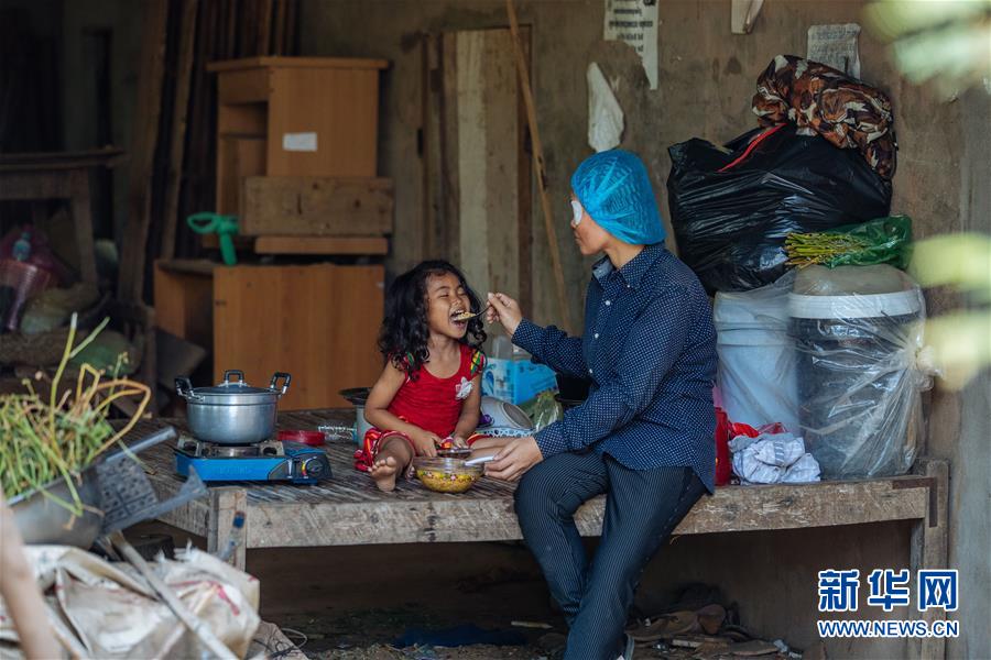 2019年3月15日,在柬埔寨磅湛,接受了白內(nèi)障手術(shù)的孫美樂回到住處給女兒喂飯。今年36歲的孫美樂是一位經(jīng)濟(jì)貧困的單身母親,和小女兒租住在一間簡(jiǎn)陋的小屋里。她的左眼因白內(nèi)障幾近失明,無(wú)法繼續(xù)工作。在中國(guó)醫(yī)生到磅湛開展義診期間,她接受了廣西醫(yī)科大學(xué)第一附屬醫(yī)院梁皓醫(yī)生實(shí)施的白內(nèi)障手術(shù),術(shù)后一天她的左眼即恢復(fù)視物。 新華社記者 朱煒 攝