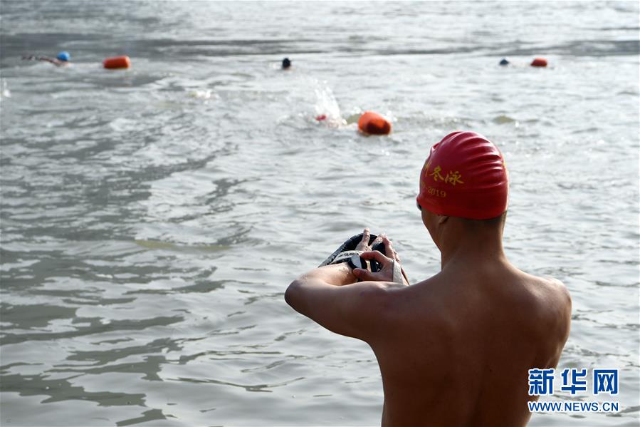 12月20日,一名冬泳愛好者在進入黃河冬泳前給自己計時。新華社記者馬寧攝