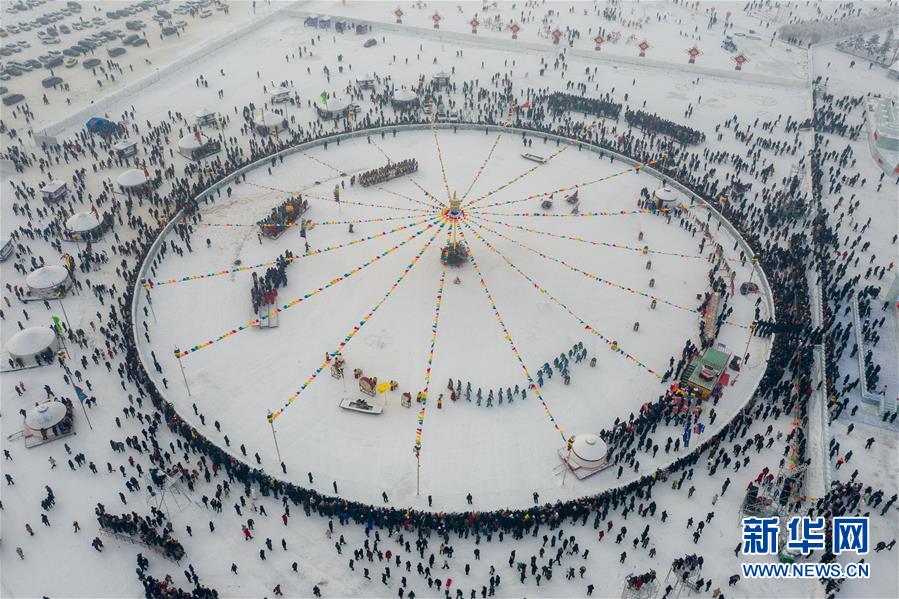 12月28日無人機拍攝的查干湖第十八屆冰雪漁獵文化旅游節開幕式現場。