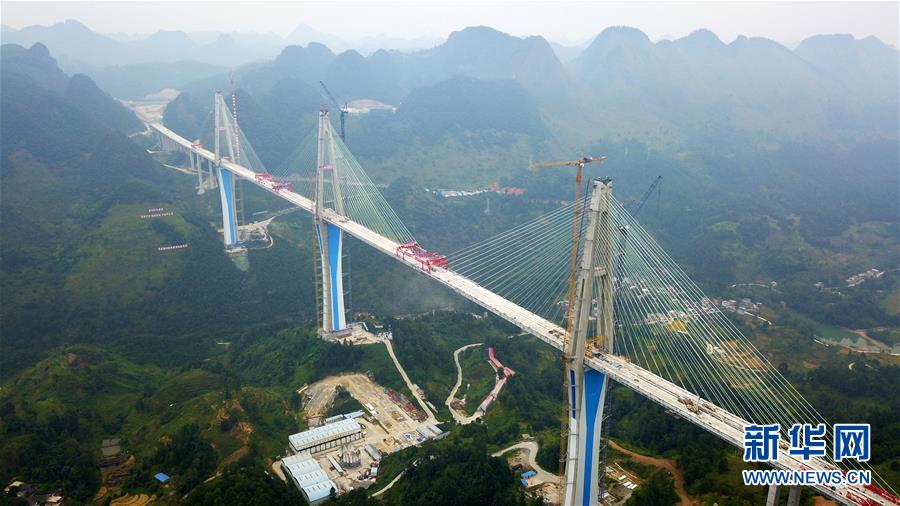當日,332米高的全球最高混凝土橋塔——貴州平塘至羅甸高速公路控制性工程平塘特大橋成功合龍。記者從貴州省交通運輸廳了解到,平塘特大橋全長2135米,橋面寬30.2米,規劃雙向4車道,是一座三塔雙索面疊合梁斜拉橋。三座橋塔的高度分別為320米、332米和298米,相當于在峽谷之中建了三座100多層高的大樓。平塘特大橋于2016年4月開工建設,2018年11月橋塔順利封頂,計劃總工期為42個月,總投資15億元。此次合龍后,還要進行橋面施工和欄桿等工程建設,預計今年底全橋通車,屆時平塘到羅甸的通行時間將從2個半小時縮短至1小時,將成為連接貴州南部的交通要道,對助推滇黔桂石漠化片區脫貧攻堅具有重要意義。