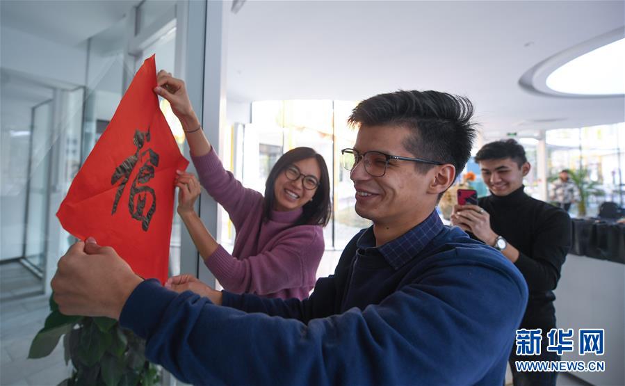 12月27日,來自俄羅斯的留學生阿布(中)在瓜山新苑社區活動中心與中國青年一起貼福字。新華社記者 徐昱 攝