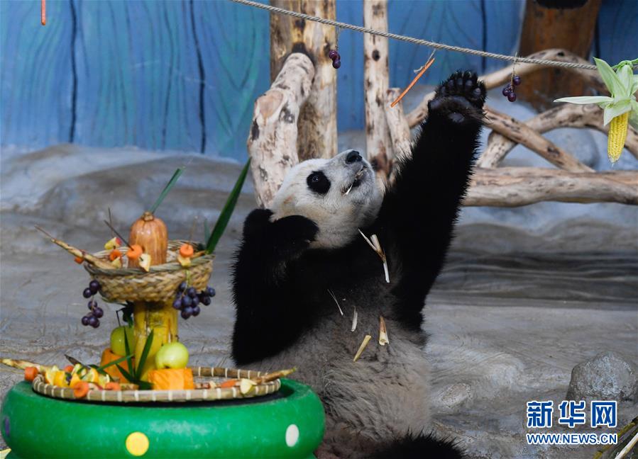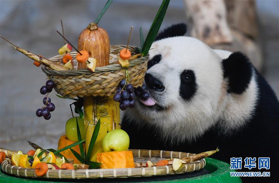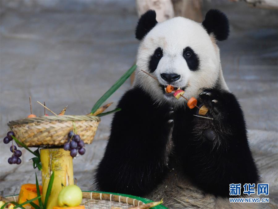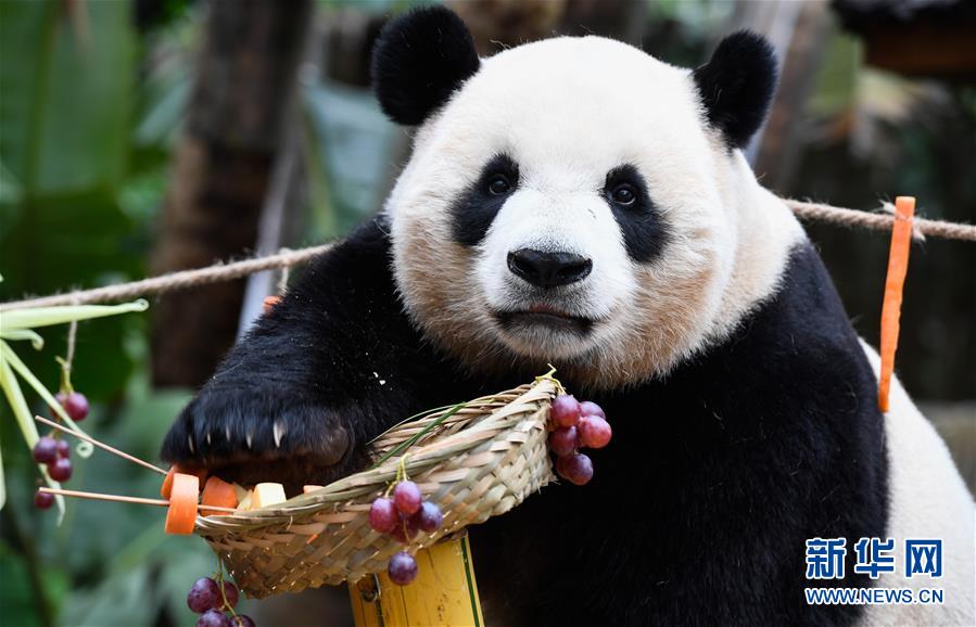 當日是2019年最后一天,海南熱帶野生動植物園的工作人員為園區內大熊貓“貢貢”“舜舜”準備了用葡萄、南瓜、竹筍等果蔬制作的“火鍋串串香”,讓它們用“擼串”的方式迎接新年的到來。 新華社記者 楊冠宇 攝