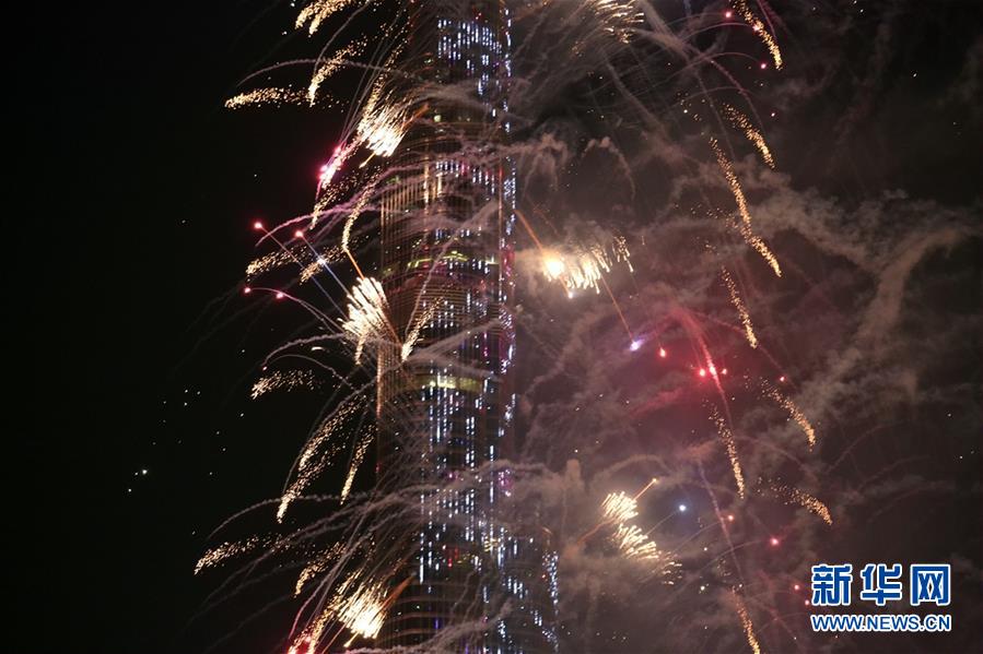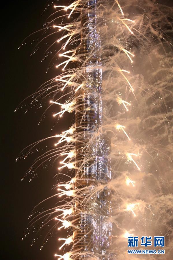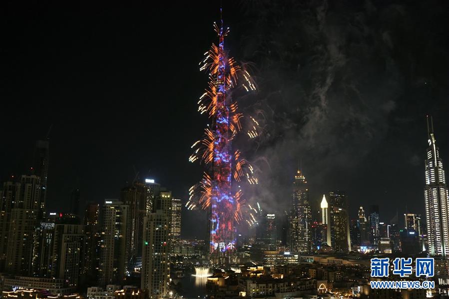 這是2020年1月1日拍攝的阿聯酋迪拜哈利法塔跨年煙火表演。新華社記者蘇小坡攝