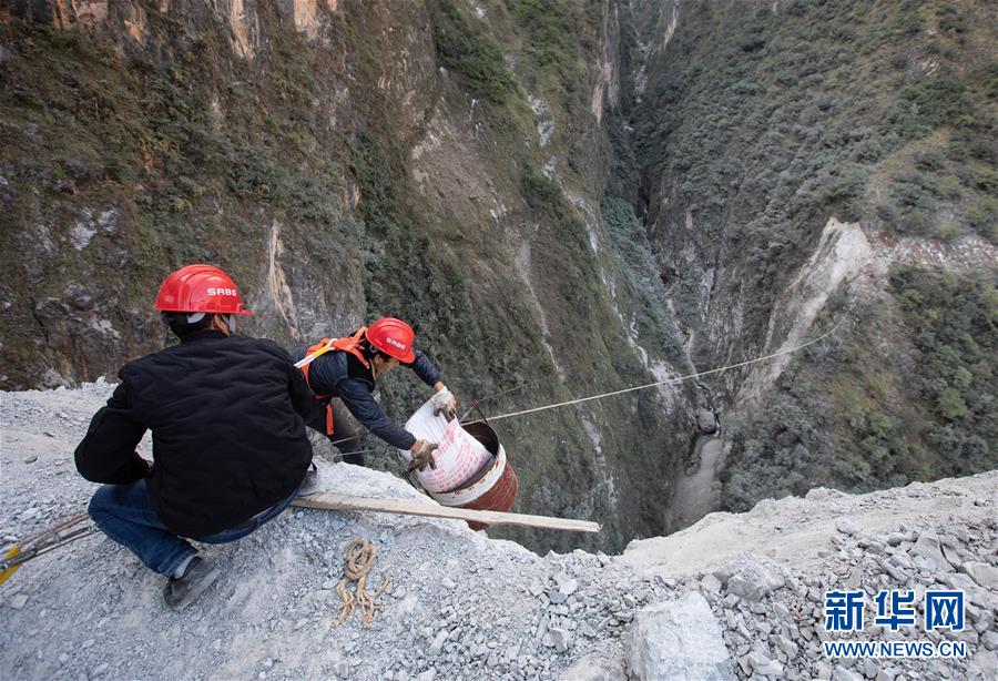 四川路橋的施工人員通過(guò)臨時(shí)搭建的溜索運(yùn)輸施工物資到峽谷對(duì)岸(2019年11月20日攝)。阿布洛哈村通村公路施工遇到陡崖夾溝地勢(shì),項(xiàng)目進(jìn)程艱難緩慢,四川路橋施工隊(duì)伍開(kāi)始在峽谷兩端分頭推進(jìn)。新華社記者江宏景攝