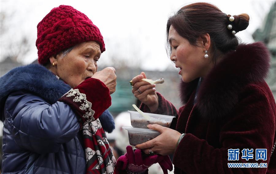1月2日,兩位市民在閬中古城貢院廣場吃臘八粥。 當日是農歷臘月初八臘八節,四川閬中古城舉行“萬人同品臘八粥”活動,當地居民和眾多游客在貢院廣場免費享用臘八粥。 新華社記者 江宏景 攝
