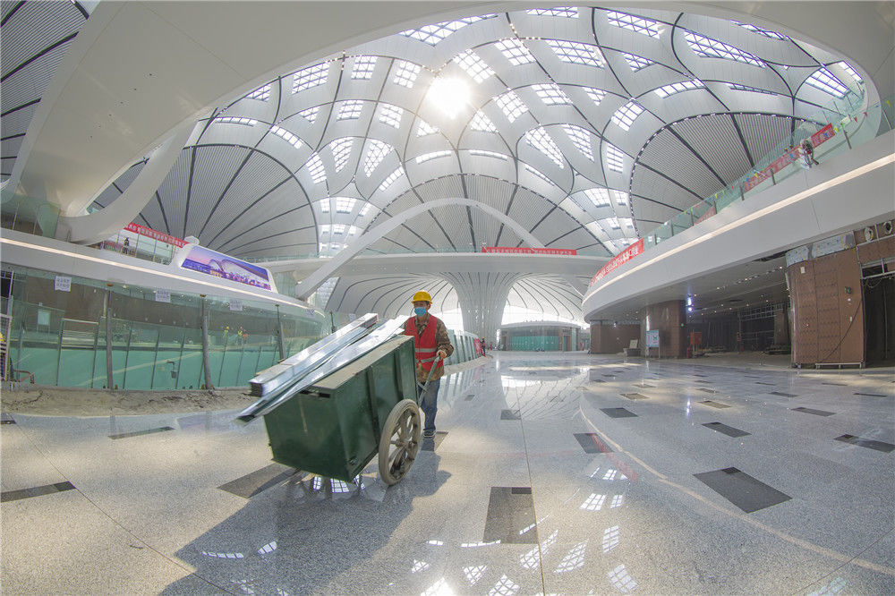 2019年4月26日,北京大興國際機場將于9月底正式通航。工程建設(shè)進(jìn)入總攻階段,目前,航站樓內(nèi)部裝飾進(jìn)行收尾的工作。武輝/千龍圖像/視覺中國